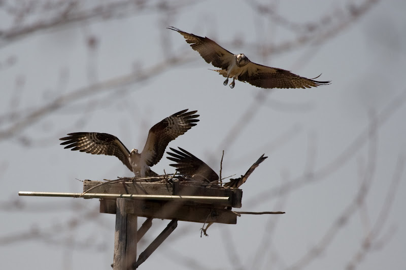 After I dropped Tina at home, I decided to stop by the Osprey platform on C2 @ Lexington, and was treated to a real show. 2 Osprey were at the nest and then decided to fly off for some fishing. Upon returning (with a large fish), a 3rd bird tried to join them, or steal the fish, or invite himself to dinner. After much noise and rearranging of the chairs, the bird with the fish returned, but was greeted once again by a loud neighbor. The nesting pair (I assume), finally flew off with the fish, to enjoy it somewhere else. Wish I’d had a video camera.