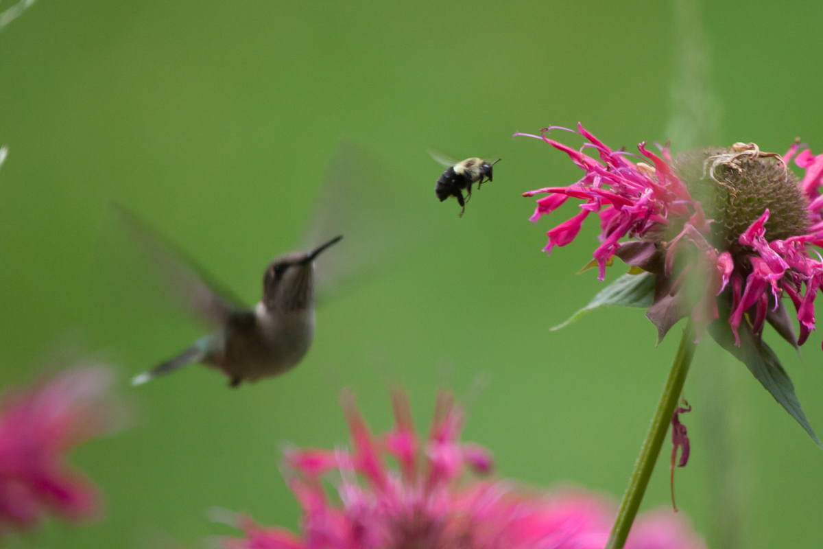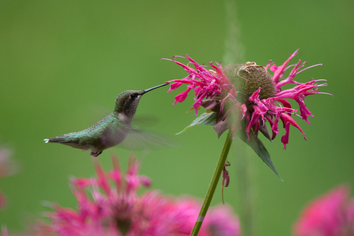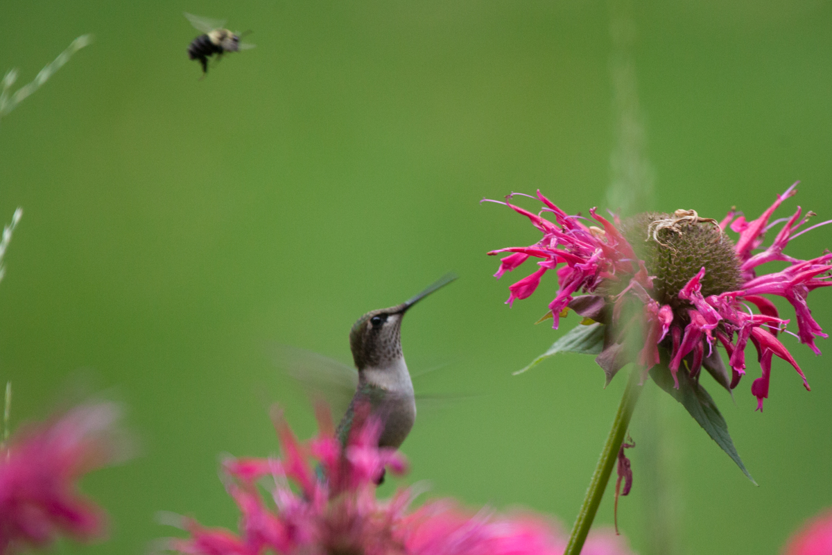 One of the plants that we discovered in the yard this spring, was Bee Balm. It is a favorite of our local Ruby-throated Hummingbirds. Bee balm also attracts butterflies and bees.